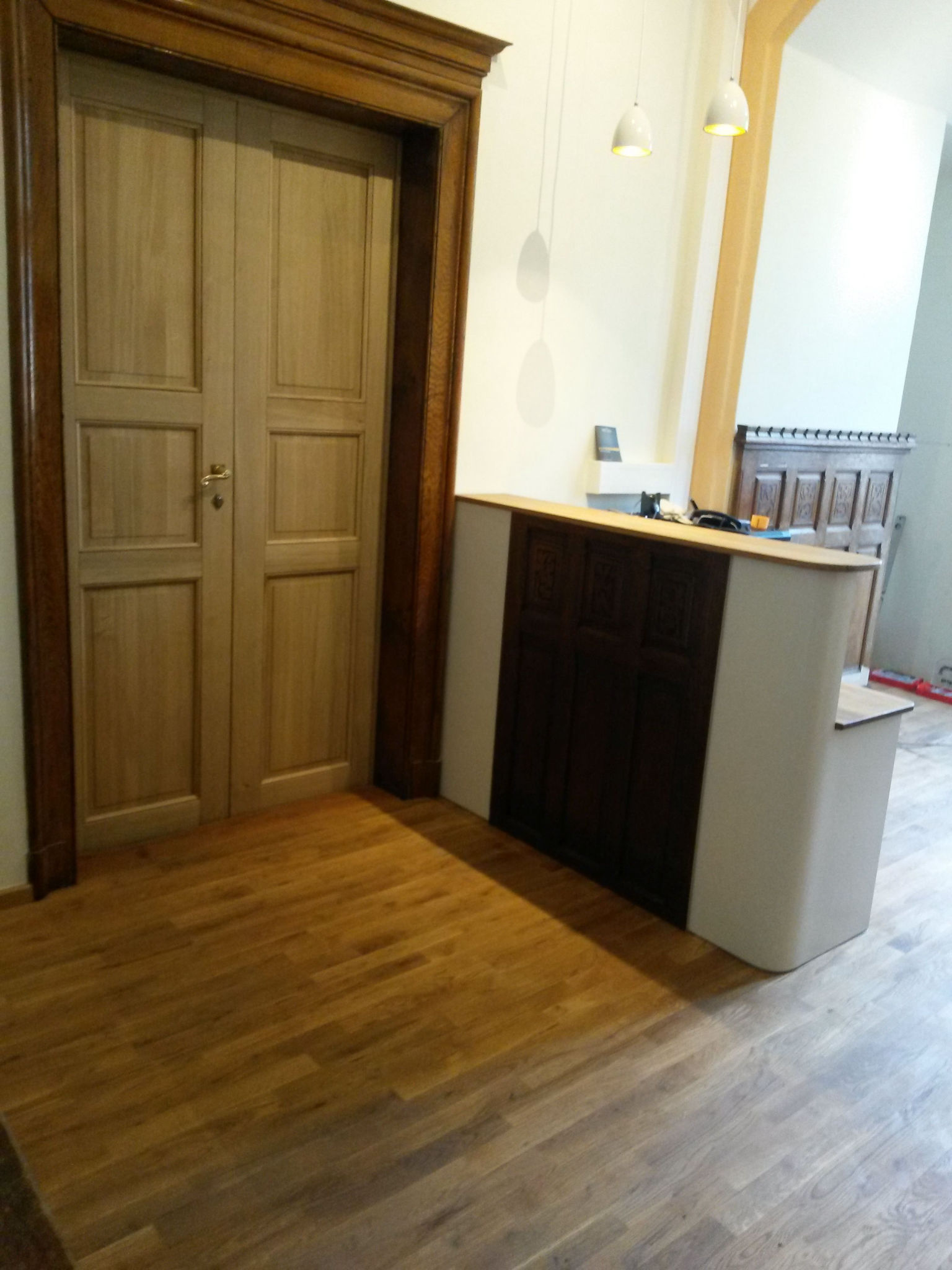 Massivholztür und Tresen mit klassischen Elemneten